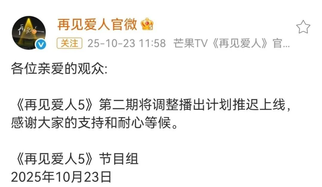 10月23日中午,《再见爱人》节目组发文回应节目停播:“各位亲爱的观众:《再见爱人5》第二期将调整播出计划推迟上线,感谢大家的支持和耐心等候。”