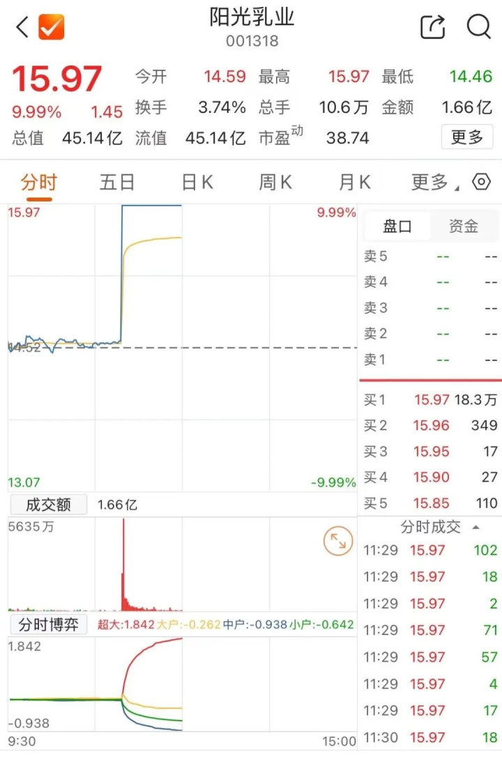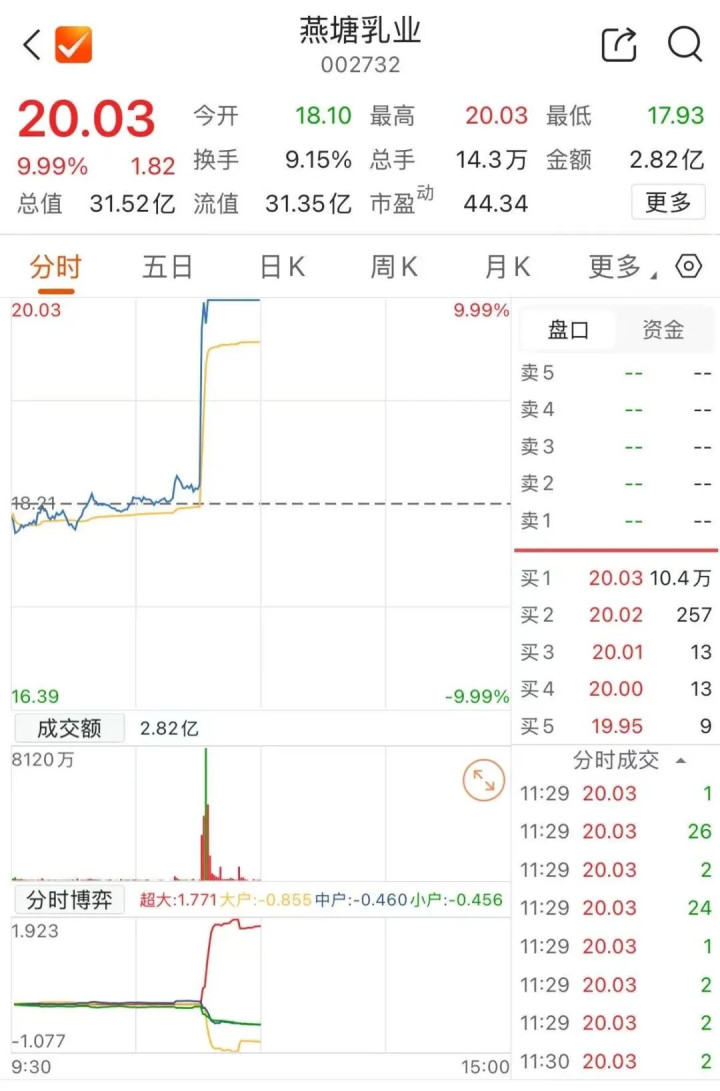 临近午间收盘,乳业股集体走强,阳光乳业、燕塘乳业双双直线拉升封板。其中,阳光乳业10:48起拉升,1分钟内涨停;燕塘乳业11时左右拉升,5分钟涨停。