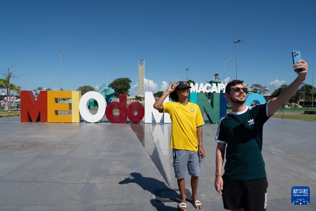 11月8日,游客在巴西马卡帕市赤道线纪念广场附近合影留念。新华社记者 王天聪 摄