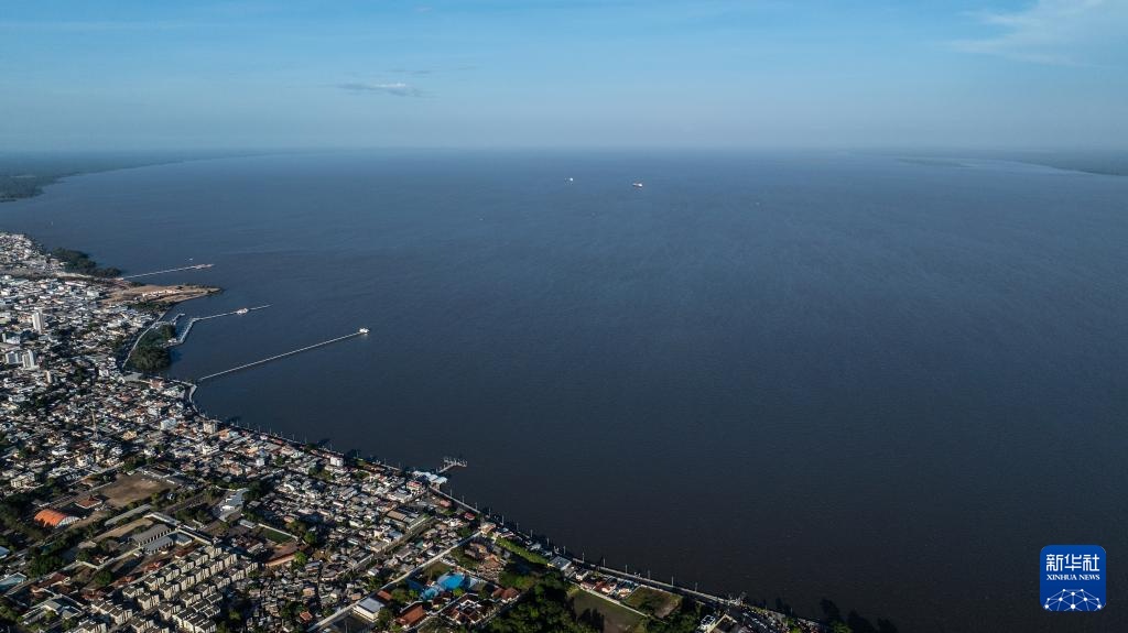 这是11月9日在巴西马卡帕市拍摄的城市与亚马孙河景观(无人机照片)。新华社记者 王天聪 摄