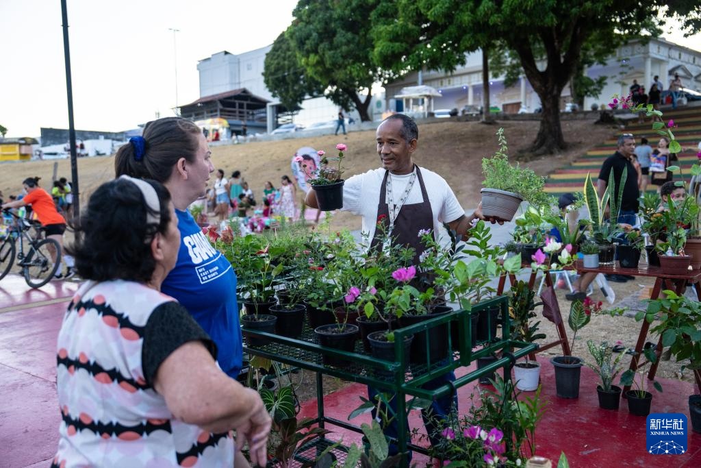 11月8日,在巴西马卡帕市一处公园,花商向顾客展示盆栽花卉。新华社记者 王天聪 摄