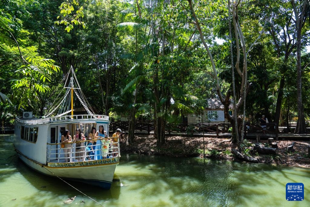 11月9日,在巴西马卡帕市的萨卡卡博物馆,游客乘船游览园区。新华社记者 王天聪 摄